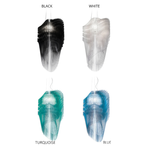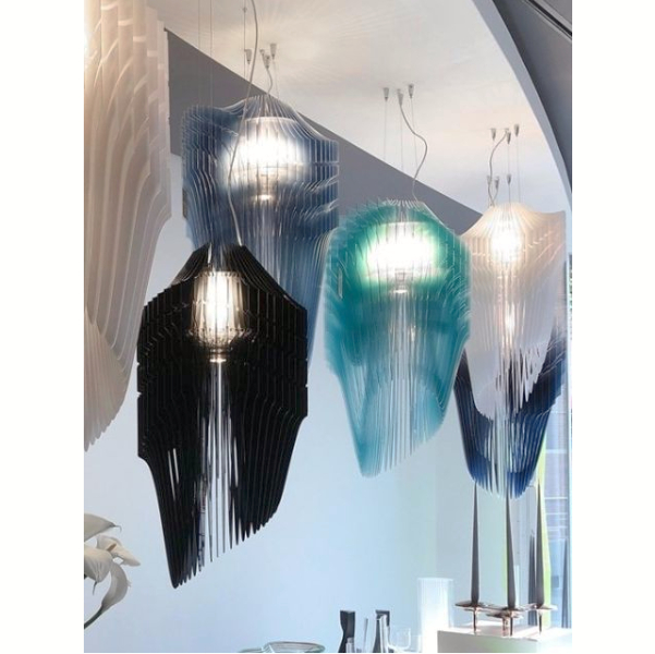 In collaborazione con Slamp, la fantastica mente di Zaha Hadid, crea un'opera architettonica luminosa: Avia. I 50 layers in policarbonato Lentiflex diversi uno dall'altro, circondano in un abbraccio la sorgente luminosa creando una scultura dall'aspetto fluido e dinamico. L'innovativo materiale Lentiflex permette con la sua particolare lavorazione di rendere la superficie "sfaccettata" ottimizzandone la luminosità ed evitando così l'abbagliamento. Avia è stata pensata in quattro diverse dimensioni e in due colori black e white, così da poter essere posizionata in ampi spazi o utilizzata in ambienti domestici quali zone living, notte, ingressi, spazi commerciali e pubblici.